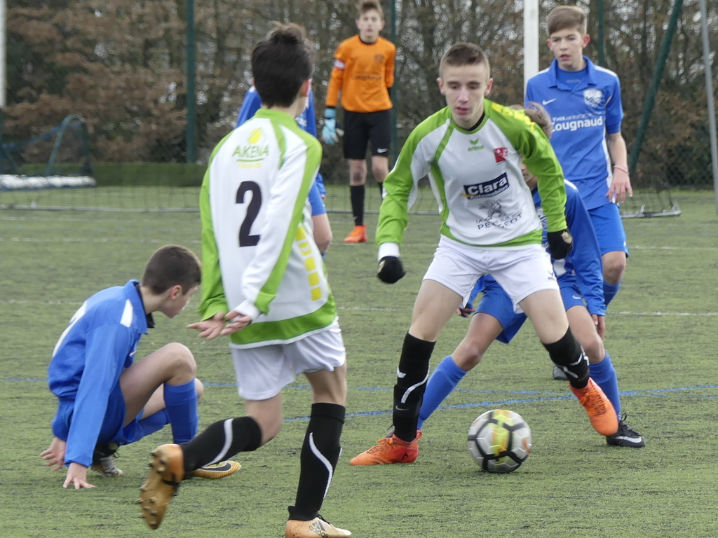 Sous un petit vent frais , mais sans pluie , LA ROCHE VF affrontait LE POIRÉ SUR VIE sur le synthétique de DESGRANGE . Les joueurs d’Adrien MERCIER allaient très rapidement ouvrir le score dès la 5’ par Paul GABORIEAU d’une jolie frappe croisée . Les yonnais donnaient du fil à retordre aux adversaires tellement il étaient supérieur en taille et dans le jeu . Malheureusement ils ne vont pas concrétiser leurs nombreuses occasions , à la 12’ sur le poteau , 20’ tir détourné au-dessus du but par le gardien du POIRÉ , à la 24’ tir dévié par un défenseur sur la transversale et à la 35’ un tir non cadré ! Bref , LA ROCHE VF aurait dû mener 3-0 à la pause mais n’avait qu’un seul petit but d’avance .