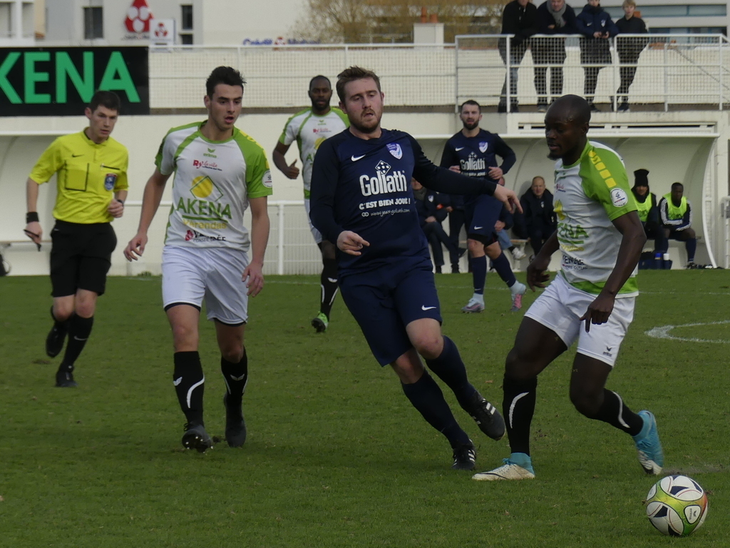 En seconde période, les jours d’Olivier BLOINO vont redoubler de longs ballons qui vont gêner les joueurs de LA ROCHE à plusieurs reprises . C’est encore Nicolas LE TALLEC à la 49’ qui réchauffera Benjamin LELLIEVRE , puis David HALLEGOT à la 56’ qui verra sa tête passer au-dessus . Du coté yonnais , Charly CHEVRIER ratera l’imanquable sur un centre parfait de Rémi DELAVAUD à la 57’ , puis c’est au tour de de Saïf SANALI à la 62’ de buter sur le gardien nantais après un joli une-deux . La délivrance viendra par le capitaine Adrien MERCIER à la 62’ sur une magnifique reprise de volée consécutive à un renvoi sur corner . 1-0 pour LA ROCHE VF . On pensait que le plus difficile était fait mais c’était sans compter sur la pugnacité et la détermination des visiteurs qui vont y croire jusqu’au bout et mettre une forte pression sur le but de LELLIEVRE . Des occasions à la 70’ , 76’ sur un coup-franc de LE TALLEC détourné , 79’ et 81’ par HALLIGOT . À la 83´ LA ROCHE VF va laisser passer une occasion de doubler la mise par Maxence MOUSSION entré en cours de jeu . Et ce qui devait arriver , arriva ! À la 86’ , sur un centre de Mand Bindy NDONGON MASSYA , Antoine FISCHER battait le gardien yonnais et remettait les deux équipes à égalité.