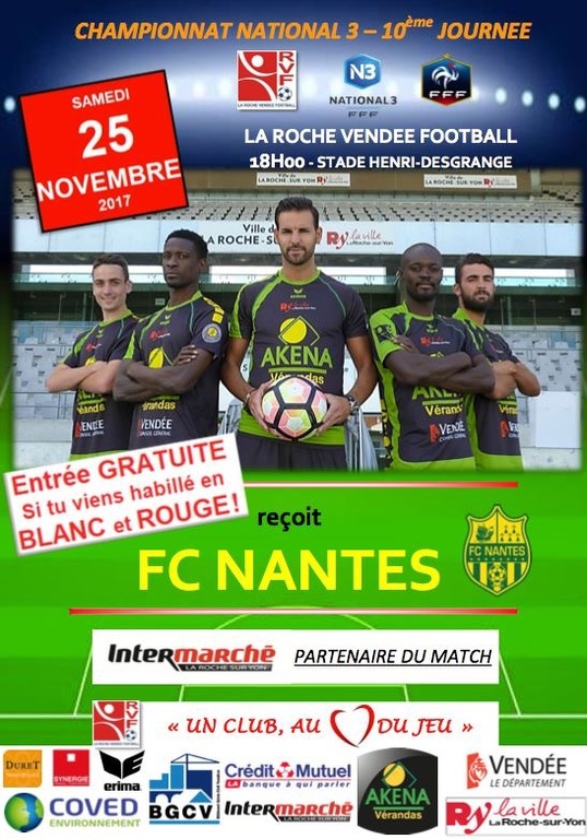 A l’occasion de la réception de la réserve du FC NANTES ce samedi 25 novembre, à 18 h00 u stade Henri DESGRANGE votre club organise l’opération « Blanc et rouge » ! En effet pour fêter l’arrivée de nos nouveaux maillots en adéquation avec les couleurs originelles de notre club, nous vos proposons une entrée gratuite à condition d’être habillé aux couleurs du club ! Nous vous attendons donc nombreux ce samedi vêtus de rouge et de blanc pour encourager nos joueurs face au leader actuel de notre groupe de National 3 !