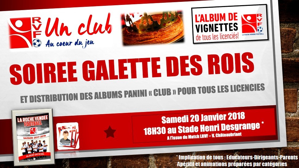 La traditionnelle galette des rois aura lieu le samedi 20 janvier 2018 dans le salon d’honneur du stade Henri DESGRANGE après le match de N3 qui opposera LA ROCHE VF aux VOLTIGEURS DE CHÂTEAUBRIANT .