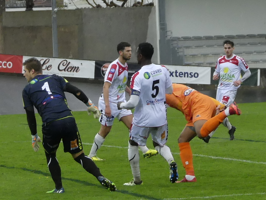 C’est avec une heure de retard et sous la pluie que la rencontre entre LA ROCHE VF et le STADE LAVALLOIS débutait sur la pelouse grasse du stade Henri DESGRANGE . Sans phase d’échauffement , les hommes de Bernard MOTTAIS débutaient la rencontre tambours battants comme s’ils s’étaient parfaitement préparés , puisque dès la 10’ Papé SARR ouvrait la marque pour les mayennais . LA ROCHE VF aura son premier tir au-dessus du cadre par Charly CHEVRIER une minute plus tard . Les hommes de Julien FRADET vont alors prendre le jeu en mains et presser le but lavallois . A la 13’ c’est Hakim BOUHENNI qui rate le cadre , à la 24’ c’est au tour d’Yves TEDJE de tirer au-dessus . Hakim BOUHENNI va enfin égaliser à la 26’ sur un centre d’Yves TEDJE . 9’ plus tard , sur un centre de Lionel NKOGO , Hakim BOUHENNI , bien placé reprend le ballon de la tête mais le défenseur mayennais touche le ballon de la main et l’arbitre Mr Guillaume PIEDNOIR indique le point de pénalty . Yves TEDJE permettra aus yonnais de marquer le deuxième but à la 36’ . LAVAL réagira avant la pause à la 40’ mais Nicolas MORATTI à la parade , stoppera le ballon dangereux au premier poteau .