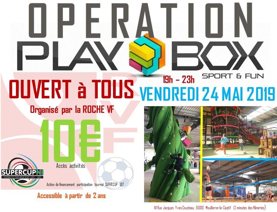 Le vendredi 24 Mai le complexe d’activité PLAYBOX (Voir vidéo) sera entièrement réservé aux membres du club de la ROCHE VENDÉE FOOTBALL . Les enfants qui souhaitent avoir accès au complexe ont la possibilité d’acheter leurs tickets au secrétariat du club. Possibilité d’acheter son ticket sur place à partir de 19h00 .