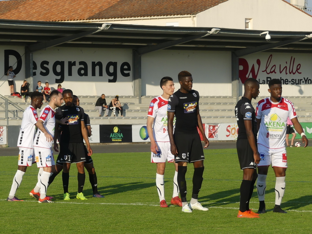 Après sa longue série sans défaite , LA ROCHE VF recevait le SCO d’ANGERS , un prétendant à la montée en N2 , sous une chaleur estivale . Le coach angevin , Abdel BOUHAZAMA alignait une équipe compétitive avec pas moins de 6 joueurs professionnels couchés sur la feuille de match . Certe, le maîtrise du ballon était à l’actif des joueurs du SCO durant les 20 premières minutes avec quelques escarmouches sans danger pour Benjamin LELIÈVRE . À la 8’ sur un tir sans conviction d’Anthoy PAYET , à la 9’ sur un coup franc tiré par Mazire SOULA et à la 16´ sur une reprise de Loïc PUYO non cadré . Sur une magnifique contre-attaque yonnaise , consécutive à un ballon récupéré par David VINET , la reprise victorieuse d’Antonin BERJON à la 19´ ne laisse aucune chance à Zachari BOUCHET . Les angevins avaient la maîtrise du jeu , mais butaient sur l’excellente défense locale emmenée par son capitaine Pierre-Alain MENDY . Si le coup-franc de Loïc PUYO finit dans les bras de Benjamin LELIÈVRE à la 25´ , la plus belle occasion pour égaliser se situe la 37´ sur un duel raté avec le gardien yonnais de Franck MAGRI après une longue chevauchée de Konguen Enzo FOKAN sur le couloir gauche . Pendant ce temps , LA ROCHE VF aura deux belles occasions de doubler la mise , à la 27’ sur un coup-franc d’Amine HAMMAR que Pierre-Alain MENDY n’arrive pas à pousser dans le but de BOUCHER , et deux minutes plus tard sur un duel raté du même Amine HAMMAR devant le portier visiteur .