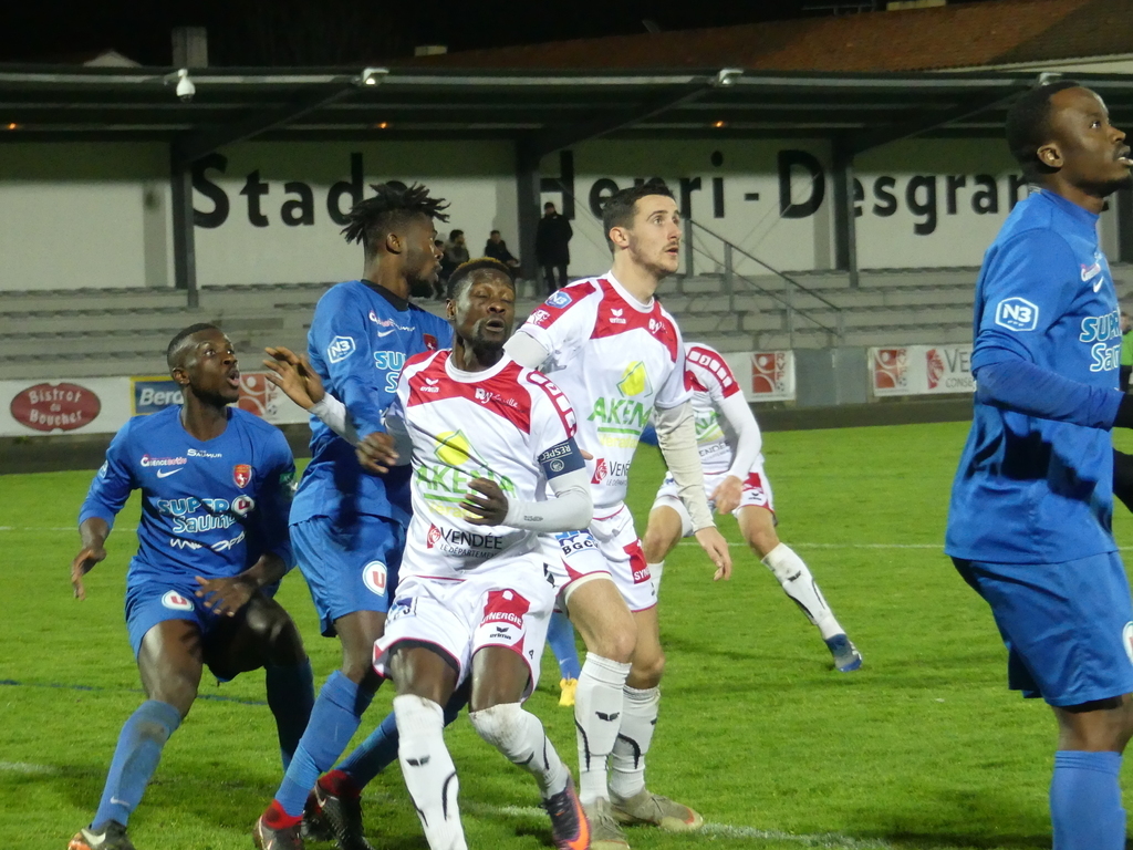 Après ces deux succès consécutifs lors des dernières rencontres de championnat les hommes de Stéphane MOTTIN recherchaient une troisième victoire contre un adversaire direct pour le maintien . Ce sont les saumurois qui auront le premier tir dangereux dès la 2’ par Yanne NOWA sur un centre de Mohammed SYLLA . LA ROCHE VF verra son nouvel attaquant , Jordi PELLURE , avoir deux occasions , à là15’ sur coup franc et une minute plus tard sur une tête au dessus de la transversale d’Anthony DAUVERGNE . L’arbitre Mr EL KOURY sifflera un pénalty généreux sur une faute pas évidente de la défense yonnaise à la 19’ . Mohammed SYLLA transforme le pénalty sans problème et 1-0 pour SAUMUR . Par la suite les locaux n’arrivent pas à bousculer la défense saumuroise et ce n’est pas le tir hors cadre d’Amine HAMMAR à la 31’qui inquiètera le gardien visiteur . Le salut viendra dans les dernières secondes de la première période sur un tir dévié de David VINET qui trompe le portier DAUVERGNE .