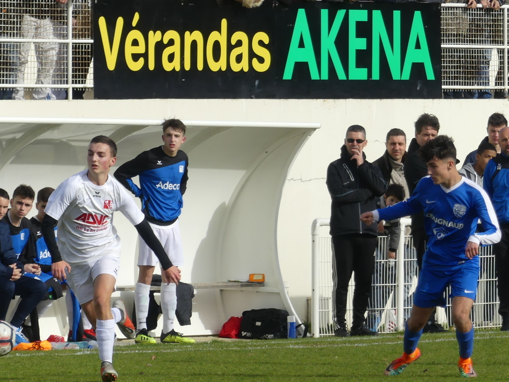 C'est dans de très bonnes conditions météorologiques mais sur un terrain en mauvais état que débutait cette rencontre entre les deux premiers du classement du championnat régional U16. Le derby commençait plutôt bien pour les visiteurs puisque dès la cinquième minute l'arbitre désignait le point de penalty sanctionnant une faute grossière commise par la défense yonnaise. Le penalty était transformé et les visiteurs menaient à la marque 1 - 0. Le POIRE SUR VIE confiant , dominait mais sans se procurer de véritables occasions. Il fallait attendre la 25ème minute pour voir les yonnais enfin se montrer dangereux, à l'issue d'un joli mouvement collectif Hugo BEIGNON décalait Thomas BOUTIN qui se présentait seul face au gardien mais sa frappe trop croisée n'inquiétait pas ce dernier. La première mi-temps n'était pas riche en occasions et les deux équipes rejoignaient les vestiaires sur ce score de 1 à 0 pour le POIRE.
