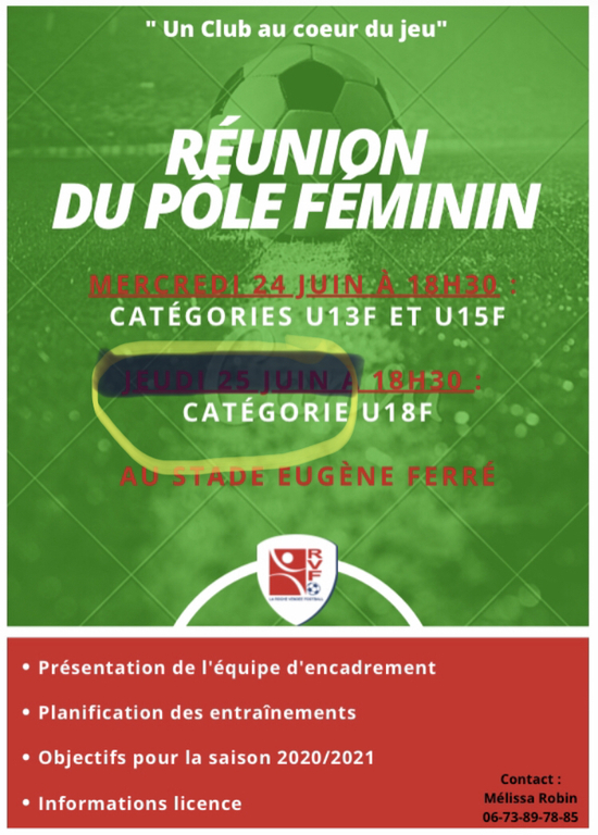 L'assemblée générale ordinaire du club ayant lieu le jeudi 25 juin 2020 , la réunion d'informations du pôle féminin concernant les U18F est avancée au mardi 23 juin 2920 à 18h30 à Eugène FERRÉ .