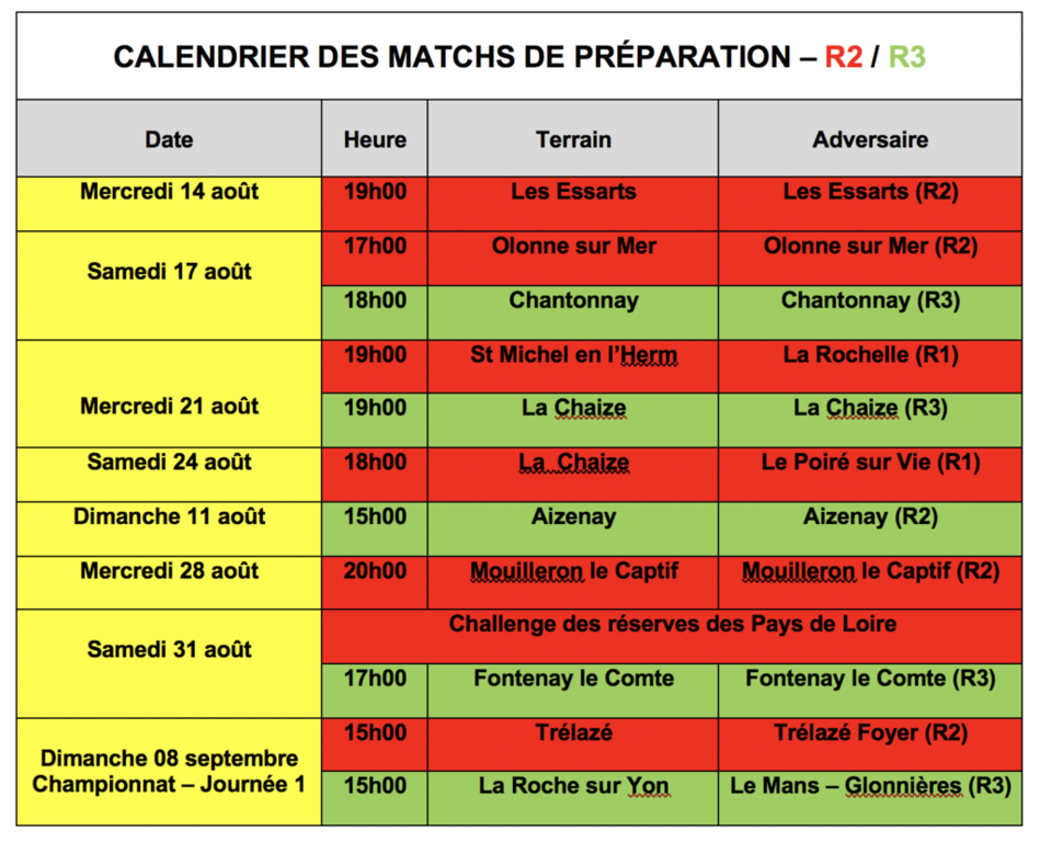 Planning des matchs de préparation pour les équipes R2 et R3 de LA ROCHE VF avant la première journée de championnat du 08 septembre 2019 .