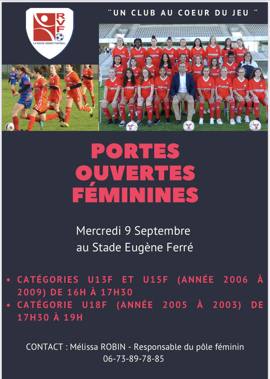 Le pôle féminin de LA ROCHE VF organise des portes ouvertes pour les féminines le mercredi 09 septembre 2020 au stade Eugène FERRÉ.