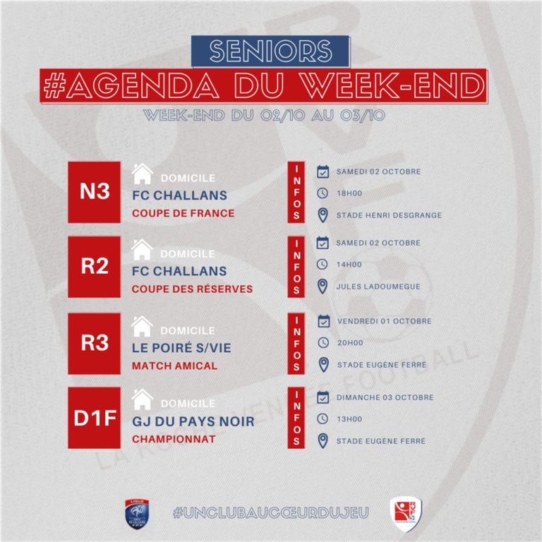 Avec notamment un alléchant derby pour notre équipe N3 face au FC Challans 85 pour le compte du 4e tour de la Coupe de France, ainsi qu'une belle affiche entre nos U14 et l'équipe du FC Nantes. On espère vous voir nombreuses et nombreux autour des terrains pour encourager nos joueuses et joueurs.