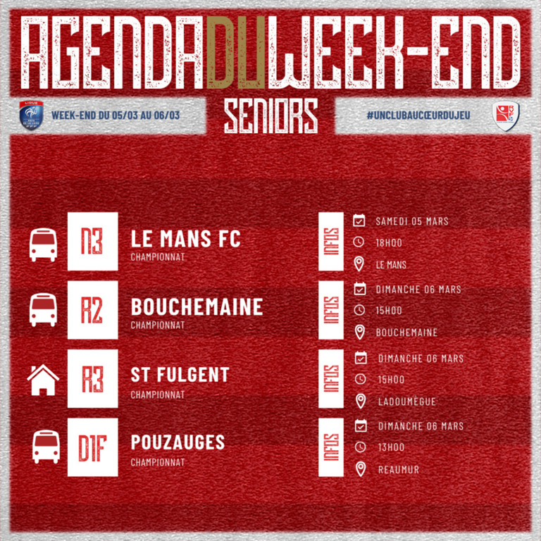 Un seul match à domicile ce week-end pour notre pôle senior avec la réception pour notre équipe R3 de Saint-Fulgent sur le terrain de Ladoumègue à 15h. Pour nos trois autres équipes ce sera match à l'extérieur, avec un déplacement face à la réserve du Mans FC pour notre équipe fanion ce samedi. Un match à Bouchemaine pour notre équipe réserve et à Pouzauges pour nos seniors féminines à 13h ce dimanche.