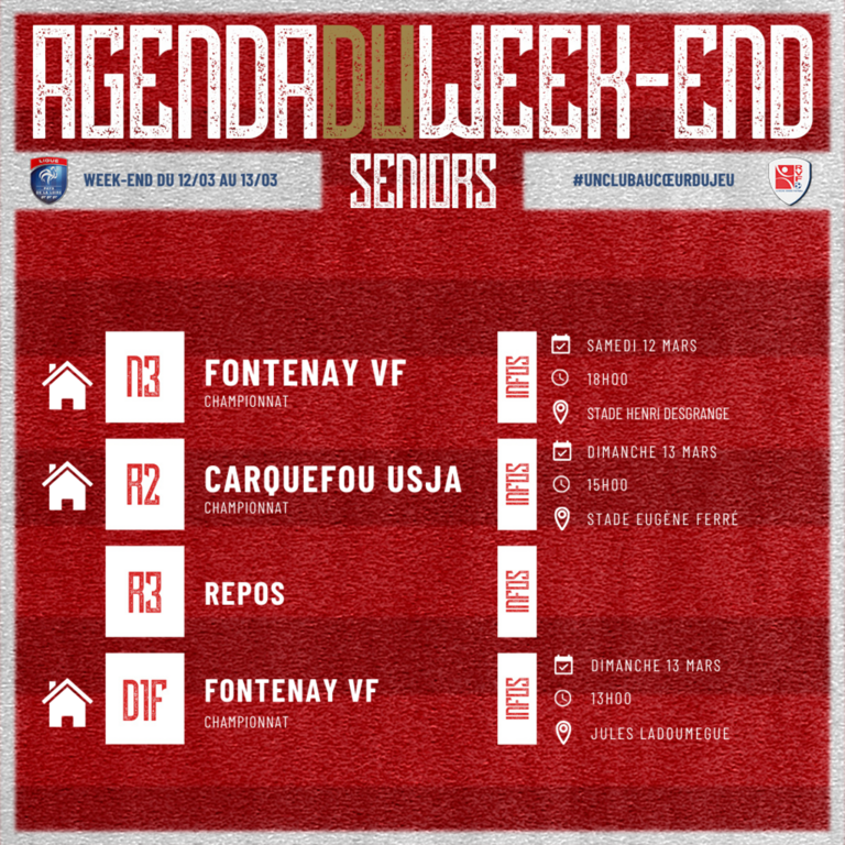 Retrouvez dans le calendrier ci-dessous, toutes les confrontations qu'attendent nos équipes ce week-end.