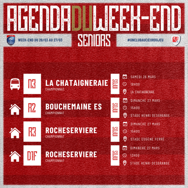 Week-end synonyme de championnat pour nos équipes du pôle senior, notre N3 se déplacera sur le terrain de La Chataigneraie ce samedi soir à 18h. À l'inverse, nos deux équipes réserves recevront ce dimanche à 15h leurs adversaires, sur le synthétique du stade Henri Desgrange pour notre R2 et sur le terrain du stade Eugène Ferré pour notre R3. Vous pourrez aussi assister à un match de notre équipe féminine ce dimanche sur le synthétique du stade Henri Desgrange face à Rocheserviere à 13h.