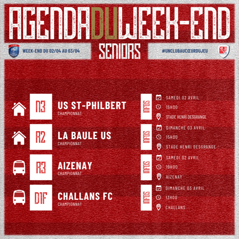Deux matchs samedi et deux matchs dimanche pour notre pôle senior sur ce week-end. Ce samedi, vous retrouverez notre équipe fanion dès 15h au stade Henri Desgrange face à US Saint-Philbert dans le cadre du championnat de national 3. Quelques heures après, vous pourrez assister au match de notre R3 sur le terrain d'Aizenay à 19h. Le lendemain, notre équipe réserve recevra La Baule US sur le synthétique du stade Henri Desgrange alors que nos seniors féminines se déplaceront au Challans FC à 13h.