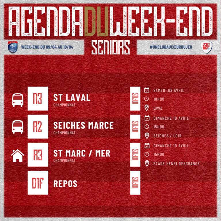 Début de la dernière ligne droite en championnat pour l'ensemble de nos équipes seniors masculines ce week-end. Celui-ci commencera avec un gros déplacement sur le terrain du Stade Lavallois ce samedi pour notre N3. Le lendemain notre équipe réserve se rendra à Seiches Marce alors que notre R3 recevra ST Marc/Mer à 15h sur le synthétique du stade Henri Desgrange.