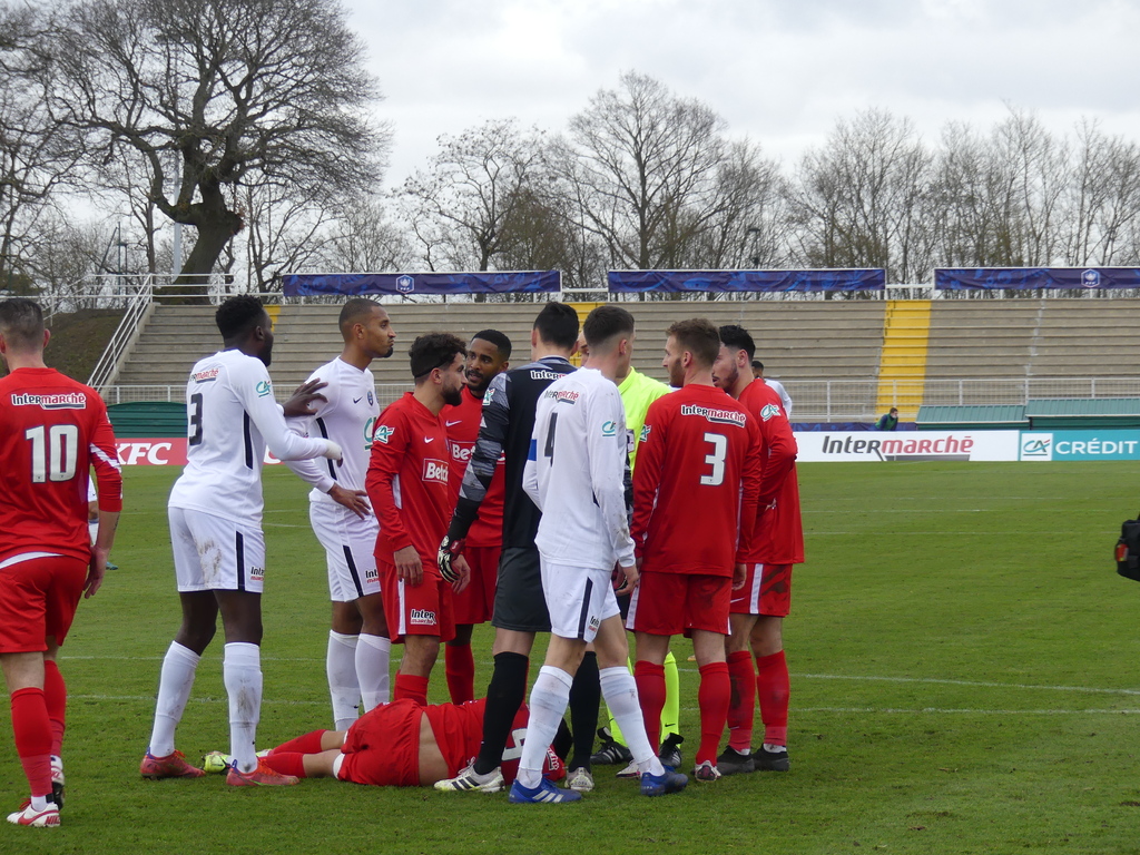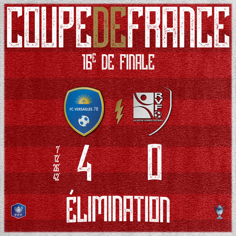 Le premier but sur coup de pied arrêté (7’, 1-0) et le deuxième sur un contre (12’, 2-0). Notre équipe avait une chance de réduire le score suite à une faute dans la surface de réparation sur Berjon, mais le gardien adverse se détendait bien pour repousser le penalty de Charrier (19’). Le calvaire des nôtres continuait puisque le FC Versailles 78 corsait l’addition à la 26’ sur une belle frappe (3-0), puis juste avant la pause sur corner (42’, 4-0). En seconde période, le score ne bougeait pas. C’est le FC Versailles 78 qui accède donc aux 8e. Bonne chance à eux pour la suite de la compétition.