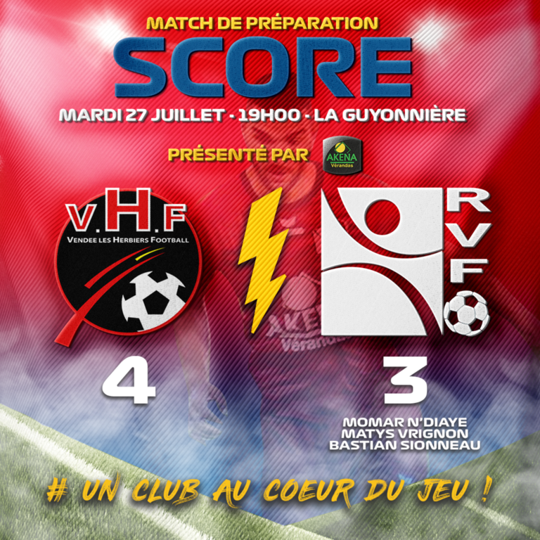 Pour le premier match de préparation, la N3 s’incline 3-4 face aux Herbiers (N2). Les 3 buteurs yonnais : Momar N’Diaye, Matys Vrignon et Bastian Sionneau ! Prochaine rencontre face à Cholet (N1), le samedi 31 juillet à 17h00, aux Essarts.