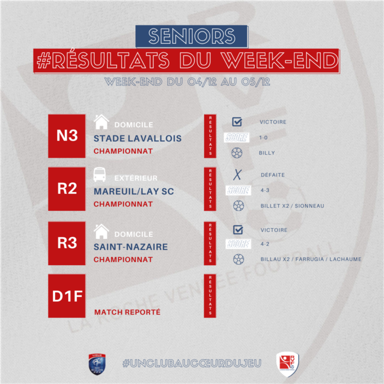 Deux sur trois pour nos équipes seniors ce week-end ! Deux victoires importantes pour la N3 et la R3 face au Stade Lavallois (1-0) et face à Saint-Nazaire (4-2). Et une défaite frustrante pour notre équipe réserve (4-3) sur le terrain de Mareuil.