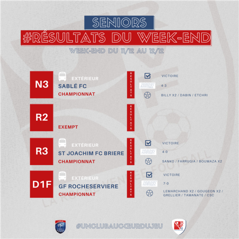 Trois sur trois pour nos équipes seniors engagées en compétition ce week-end. Un festival de buts pour les féminines avec leur victoire 7-0 face au GF Rocheservière. Un clean-sheet et quatre buts marqués pour notre R3 puis pour finir une victoire au bout du suspense pour le groupe N3, 4-3 sur le terrain du Sablé FC.
