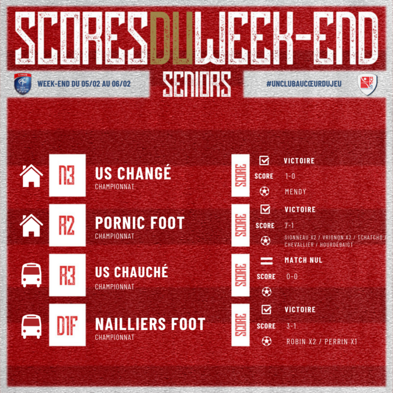 Pluie de buts sur le stade Henri Desgrange ce week-end avec la victoire de notre équipe réserve sur le score de 7 buts à 1 face à Pornic Foot alors que pendant ce même temps notre R3 ramenait un point de Chauché. Plus tôt dans ce dimanche après-midi ce sont nos seniors féminines qui se sont imposé 3-1 face à Nailliers Foot en championnat. La vieille notre équipe fanion avait su remporter les trois points dans le temps additionnel face à l'US Changé grâce à un but de MENDY.