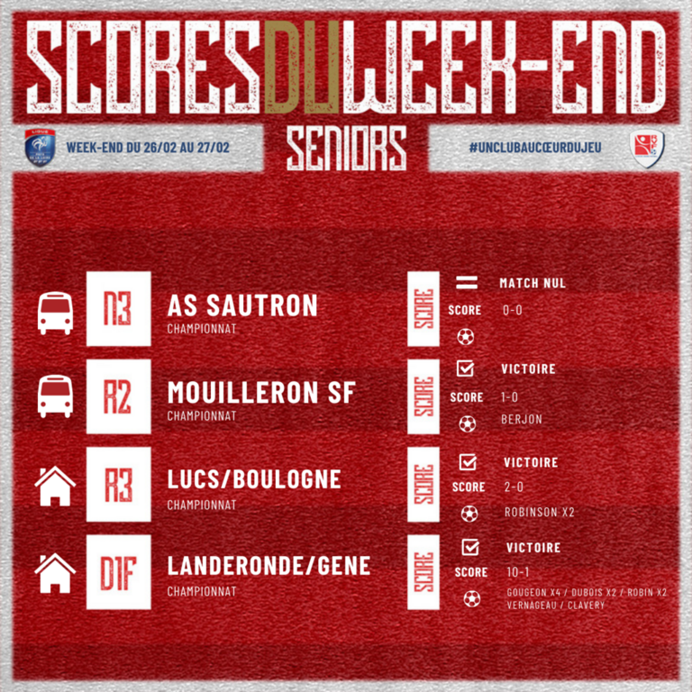 Malgré un match nul de notre équipe fanion sur le terrain de l'AS Sautron ce samedi soir. C'est un quasi-sans-faute pour notre pôle senior ce dimanche grâce aux victoires 1-0 et 2-0 de nos équipes réserves masculines et un festival de buts pour notre équipe féminine face à Landeronde/Gene sur le synthétique du stade Henri Desgrange.